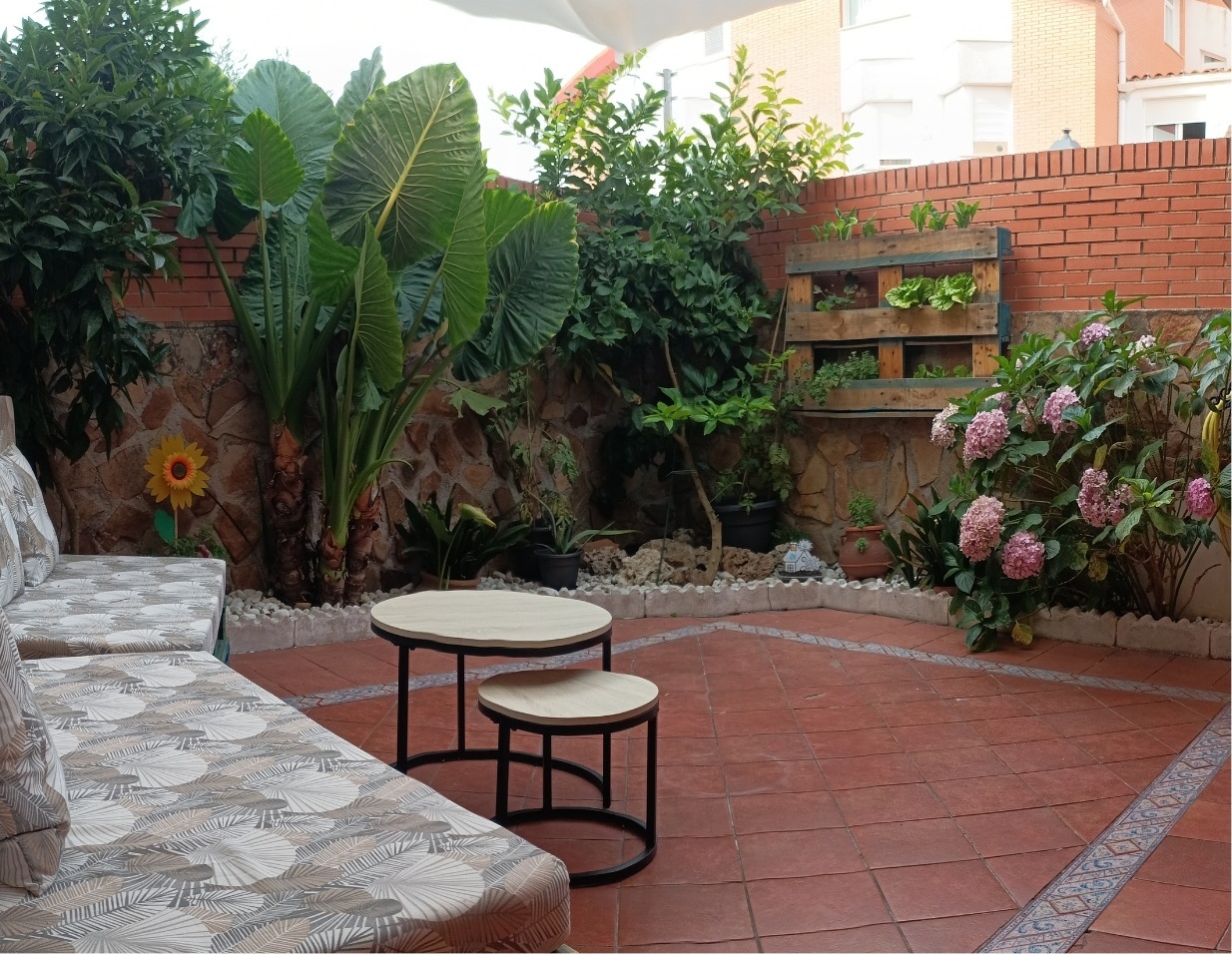 El patio se sitúa en la entrada de la casa y cuenta con un bonito jardín, en el que hay un limonero, un naranjo, varias plantas decorativas y un pequeño huerto vertical. Cuidar sus plantas será una de las actividades que los niños y las niñas podrán realizar diariamente.