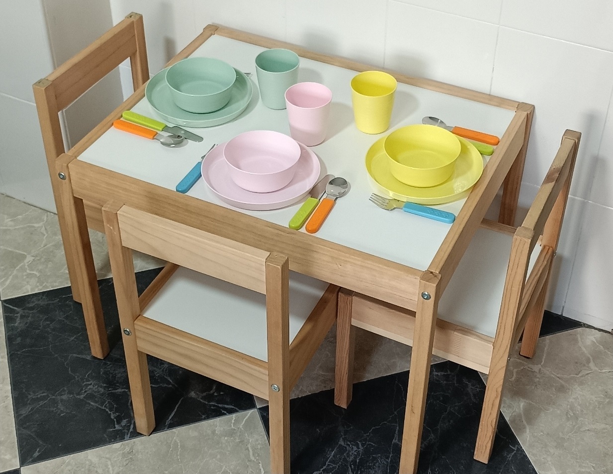 La cocina dispone de una pequeña mesa y cuatro sillitas de madera, donde los niños y las niñas podrán comer cada día con luz natural. Asimismo, hay una trona tipo Stokke, por sí algún niño o niña todavía no estuviese lo suficientemente maduro como para usar una sillita. Además, tienen a su alcance los platos, vasos y cubiertos que usarán durante las comidas. Igualmente, este espacio cuenta con un extintor situado en la despensa, el cual revisa un técnico anualmente.