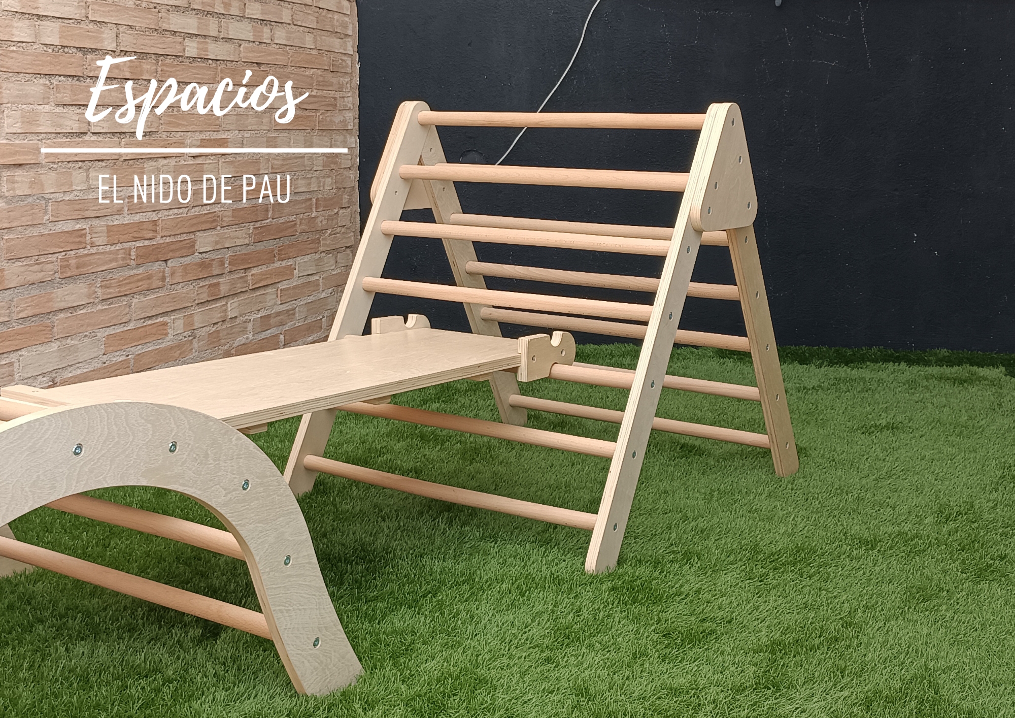 Este espacio tiene una puerta que da a un pequeño patio al aire libre, donde los niños y las niñas pueden jugar con material Pikler y pintar en la pizarra que hay en la pared.