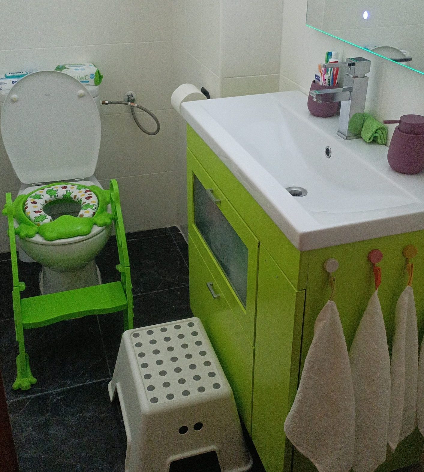 Así pues, el baño cuenta con un escalón para que los niños y las niñas puedan asearse en el lavabo de forma autónoma, así como con un adaptador para el WC para que puedan ir al baño por sí mismos.