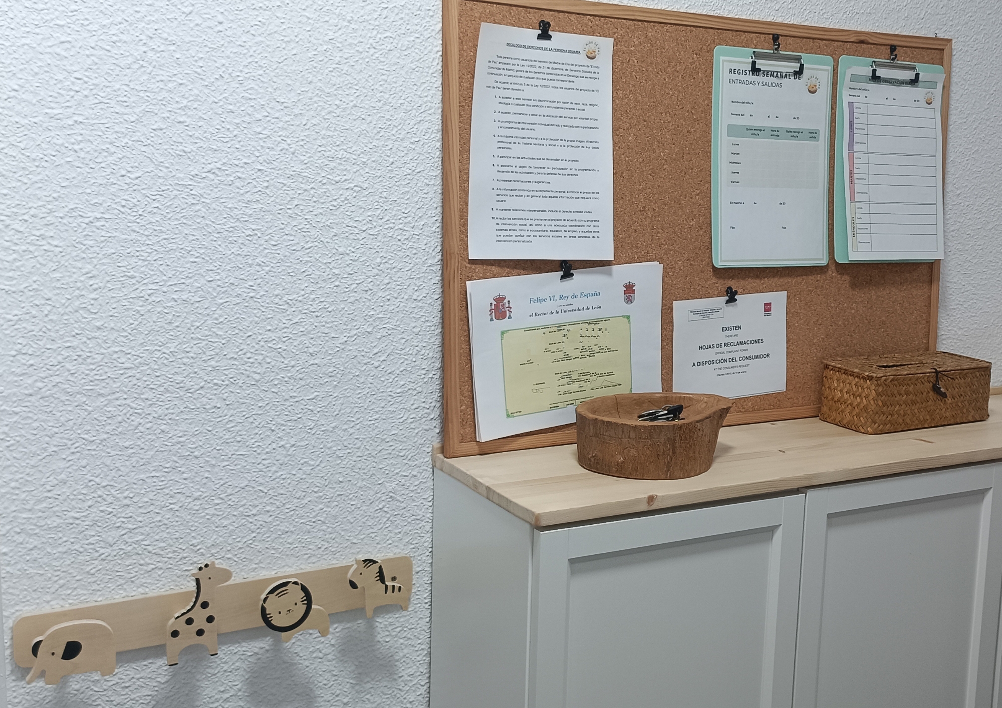 Además, en esta zona se encuentra el corcho con el decálogo de derechos de las personas usuarias, información sobre las normas de funcionamiento de la iniciativa, etc. y un buzón de sugerencias en el que las familias pueden aportar sus opiniones de cómo funciona la casa y qué les gustaría que se hiciera.